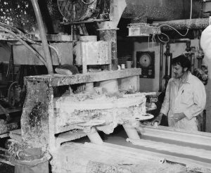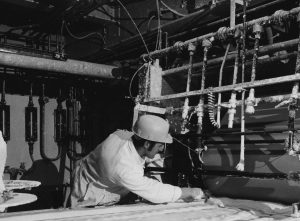 In 1976 the Cove Plant was built. Coving was already produced at 2 other British Gypsum sites in the UK but the rise in popularity gave way to another extension of the building at Sherburn to accommodate a Coving line in 1976. The line was extended in 1978 to enable an increase from 25 metres per minute to 40 metres per minute in production. Here we see David Chapman filling one of the additive silos used in the making of coving.