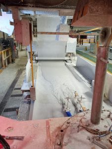 After a few trial runs the No1 Board Plant was up and running in the spring of 1971 producing various widths, thickness and lengths of plasterboard. The pictures below show the Board Plant mixer where the plaster is made (slurry) which then flows onto the paper and is formed into one long line of plasterboard at the extruder and then the Take Off where the Plasterboard is trimmed to size and stacked onto pallets.